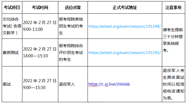 使用易考在线考试系统作为我院组织网络考试的平台,操作指南详见附件(其中,单招和综评考生详见附件1,退役军人面试考生详见附件2)。考生在每场考试前30分钟,将会收到易考平台发送的手机短信提醒,短信中会有考试链接,考生需将链接复制到考试指定浏览器地址栏打开即可进入登录界面。考生如果因为手机号码错误等原因没有收到短信,也可以通过单击如下表格中对应的正式考试地址链接进入考试。