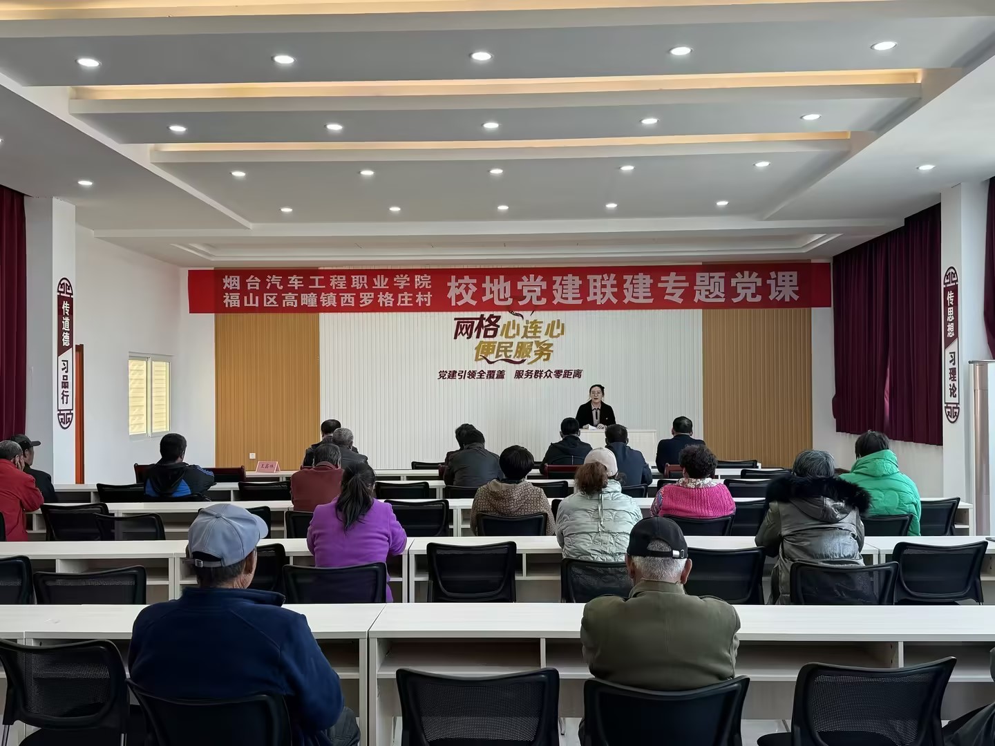 为深入学习贯彻党的二十届三中全会精神和习近平总书记关于“三农”工作的重要论述,全面落实学院第三次党代会精神,扎实开展市派“第一书记”包帮工作,11月19日下午,烟台汽车工程职业学院党委与福山区高疃镇西罗格庄村党支部在村党群服务中心举办校地党建联建专题党课活动。高疃镇党委副书记陈锋,镇党办主任贾同治,西罗格庄村党支部书记、村委主任柳光君以及村两委班子成员,学院党委副书记曲耀春,纪委副书记鞠秀德,学院派驻“第一书记”王鑫林及村党员代表20余人同上一堂党课。党课由烟台市基层党组织书记宣讲团成员、马克思主义学院综合科副科长王叶主讲。