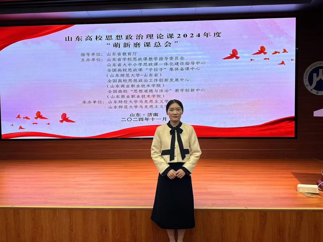 11月29日,由山东省教育厅指导,山东省学校思政课教学指导委员会、山东省大中小学思政课一体化建设指导中心、全国高校思政课“手拉手”集体备课中心、全国高校思想政治工作创新发展中心、全国高校“思想道德与法治”教学创新中心主办,山东财经大学马克思主义学院、山东师范大学马克思主义学部承办的山东高校思想政治理论课2024年度“萌新磨课总会”在济南举行。我院思政课教师袁美在“萌新磨课”年度总决赛中荣获一等奖。