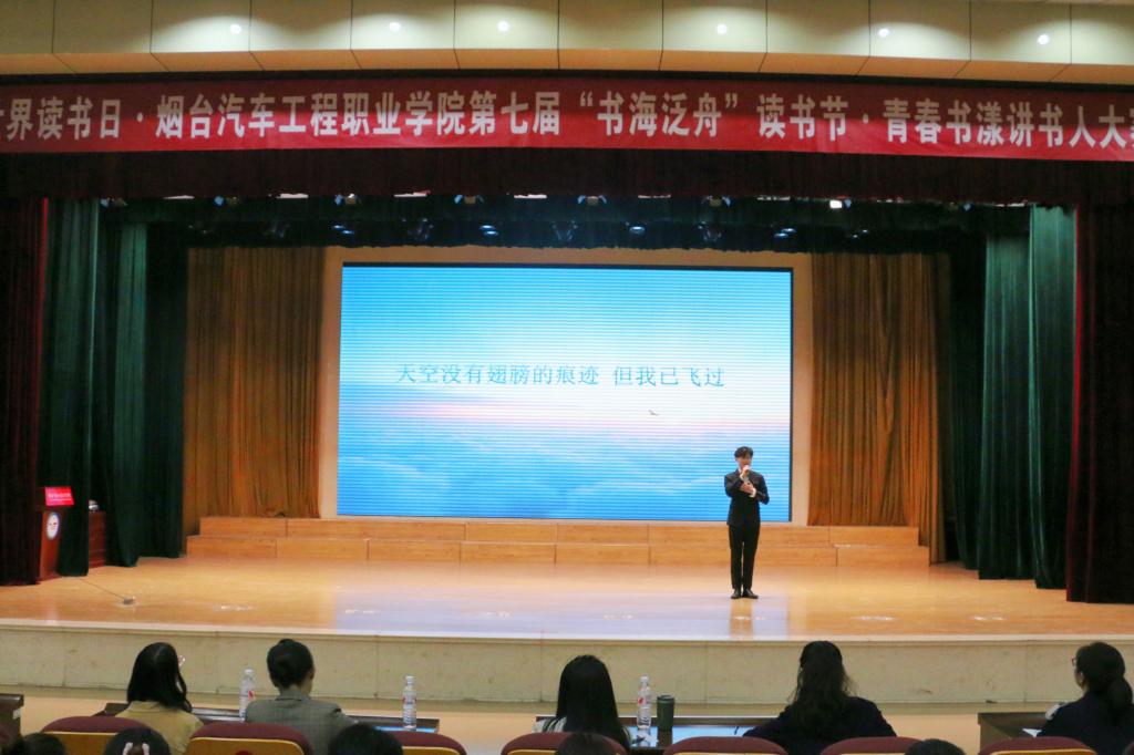 在第30个“世界读书日”来临之际,为深入推进“书香校园”建设,激发青年学子阅读热情,4月18日下午,烟台汽车工程职业学院举办第七届“书海泛舟”读书节系列活动之青春书漾讲书人大赛决赛。学院团委宣传部长孙晓辉、“书海泛舟”读书会创始人韩如坤、帆书(原樊登读书)认证讲师李小云、王茜及师生代表800余人齐聚现场,共赴一场思想与情感的盛宴。