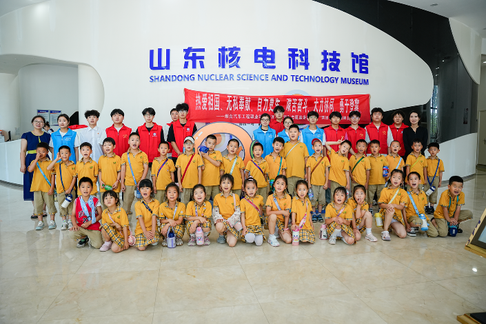 宣讲团走进山东核电科技馆,先沉浸式参观核电发展历程,汲取科技奋进力量。随后成员化身专业“讲解员”,带领市民穿梭各展区,既生动讲述“两弹一星”英雄事迹,又展示核技术在多领域的应用成果。