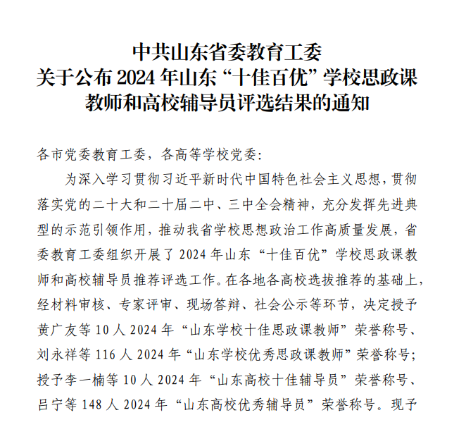 近日,中共山东省委教育工委公布了2024年山东“十佳百优”高校辅导员评选结果。我院电子工程系卞瑞姣、信息与控制工程系王德生两名专职辅导员首次同时获评“山东高校优秀辅导员”。