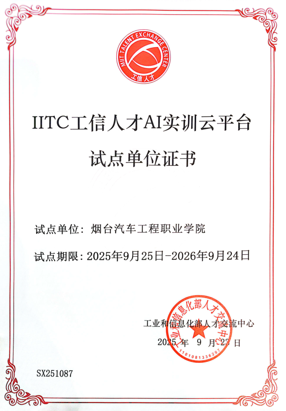10月27日,工业和信息化部人才交流中心发布《公布IITC工信人才AI实训云平台首批应用院校的通知》,烟台汽车工程职业学院成功入选首批IITC工信人才AI实训云平台试点单位。