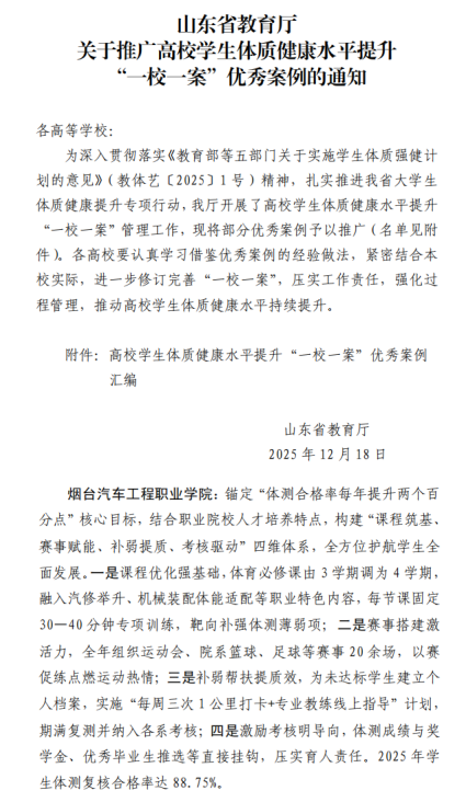 一系列务实有效的举措推动学院学生体质健康水平持续跃升,2025年学生体测复核合格率达88.75%,位列全省高职院校第4名,圆满完成“体测合格率每年提升两个百分点”的核心目标。未来,烟台汽车工程职业学院将以此次入选优秀案例为契机,持续深化体育教学改革,不断完善体质健康提升体系,着力培养“体魄强健、职业适配、全面发展”的高素质技术技能人才,为职业教育高质量发展注入体育动能。