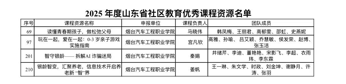 长期以来,我院始终坚持“立足地方、服务地方”的办学理念,以终身教育体系建设为抓手,不断整合师资、专业等优质资源,依托学院本部与下属社区教育指导服务中心的联动优势,打造了一批贴合社会需求的精品课程。此次多项课程入选省级名单,是对我院终身教育工作的充分肯定。未来,我院将继续发挥教育资源优势,持续优化课程体系,深化校内资源整合与校地协同合作,推出更多符合社会需求的优质课程资源,为推进学习型社会建设、赋能地方经济社会高质量发展贡献更多教育力量。