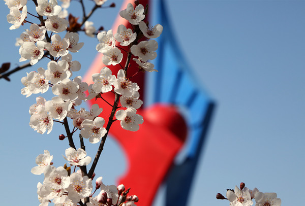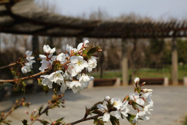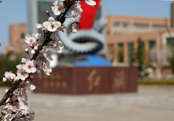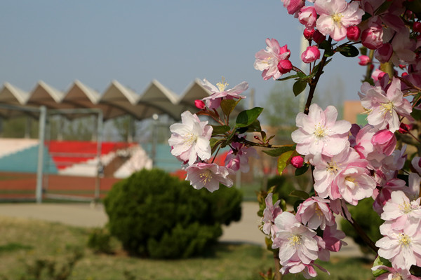 四月,空气中都是天蓝的味道,熏风催动一瓣瓣婆娑的念,杏烧红,桃剪锦,草揉蓝。校园如许,收尽春光。