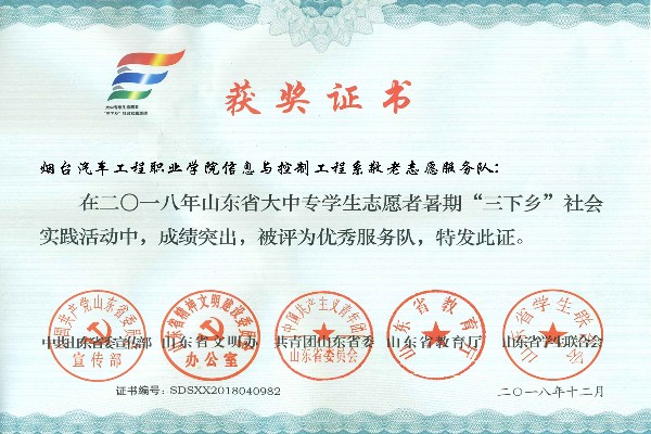 日前,信息与控制工程系敬老志愿服务队被中共山东省委宣传部、山东省文明办、共青团山东省委、山东省教育厅、山东省学生联合会联合授予2018年山东省大中专学生志愿服务“三下乡”社会实践优秀服务队。