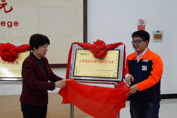 在热烈的掌声中,学院党委书记李翠玲和余刘斌经理共同为吉利集团人才培养基地、吉利集团台州V项目订单班揭牌。标志着校企双方基地共建、人才共培、互利共赢、为人才培养创造更好的条件、给学生提供更优质服务的合作正式拉开大幕。