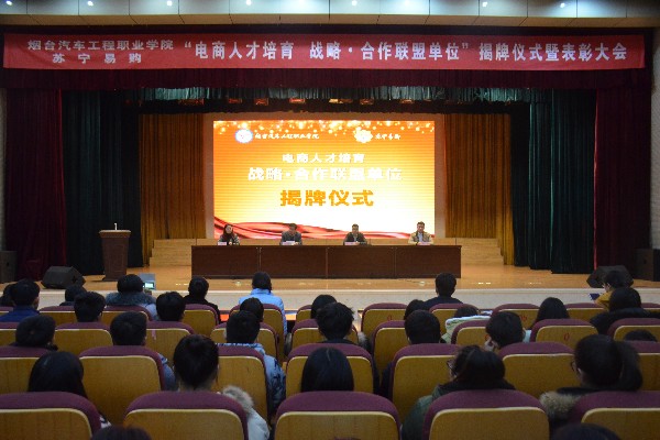 12月1日,烟台汽车工程职业学院、苏宁易购“电商人才培育战略﹒合作联盟单位”揭牌仪式在我院报告厅举行。学院副院长姜义昌、猫宁电子商务有限公司总监黄翔先生、临沂商城电商学院副院长时东出席活动,经济管理系500余名师生参加了活动。仪式由经济管理系负责人主持。