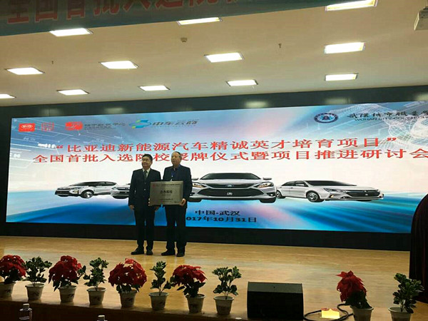 10月31日,“比亚迪精诚英才培育项目”全国首批入选院校授牌仪式暨项目推进研讨会在武汉城市职业学院隆重举行。学院副院长孙涛、电子工程系新能源汽车专业负责人郭三华代表学院参加了授牌仪式,比亚迪公司销售副总高子开先生为我院授牌。