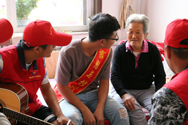 下午两点,信控系崔健峰、刘翔鹏、吴德健等大二学生带领五十多位青年志愿者来到了福山门楼敬老院,为老人们送上精彩节目以及月饼和鲜花。大家为老人们带来了吉他弹唱,大合唱《当祖国召唤的时候》等等,激情澎湃的歌声,引得平日不爱出门的老人都前来观看,随后志愿者们三五一群跟老人们唠家常,讲笑话,其乐融融。活动期间,一名九十一岁高龄的老人,在接到鲜花及月饼后,拉着志愿者的手久久不愿松开连声道谢。