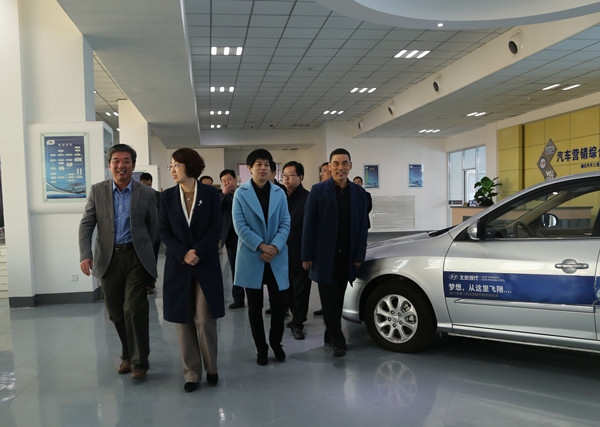 祁小青书记一行首先来到学院实训中心,先后实地考察了我院机器人、汽车营销实训场地及戴姆勒、博世、北京现代、巴斯夫、捷豹路虎等校企合作实训项目,每到一处都详细了解实训设备、场地及人才培养等情况。