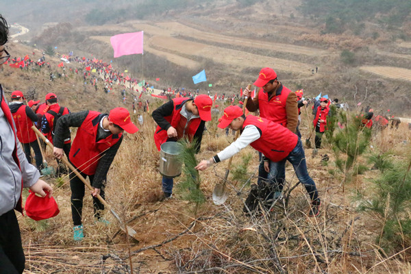 回里镇有山有水,景色宜人,但志愿者们却来不及欣赏美景,很快得来到山坡上,开始栽种树苗,大家协同配合,有的提水,有的挥锹培土,干劲十足,不一会儿山坡上就不再是枯草而是一片翠绿的小树苗,虽然还是初春,但志愿者的脸上已经有点点汗珠……。