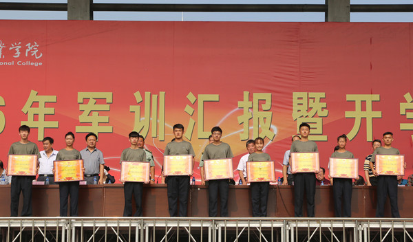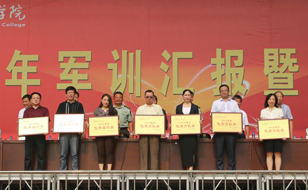 军训汇报表演在庄严的国歌声中拉开序幕。伴随着激昂的进行曲,各受阅方队在各班级辅导员带领下,迈着矫健的步伐从主席台前走过,抖擞的精神、严整的军容、矫健的步伐、响亮的口号,充分展现了我院学子昂扬进取的风貌。军训汇报表演结束后,我院对今年军训工作先进单位和先进个人进行了表彰,共评选出军训先进单位7个、军训优秀班集体25个、优秀辅导员23名,军训标兵173人、军训内务标兵36人,院领导和部队首长为受表彰的单位和个人颁发了奖状和证书。