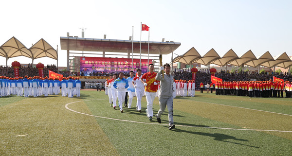 接下来的火炬传递仪式,预备役步兵76师栾春盛副政委将点燃的火炬交给了机电工程系火炬手赵保成,象征着青春与梦想的火炬在我院学子手中传递,火炬手护送火炬绕场一周后将火炬盆点燃,美丽的焰火在运动场上空如花朵般绽放。