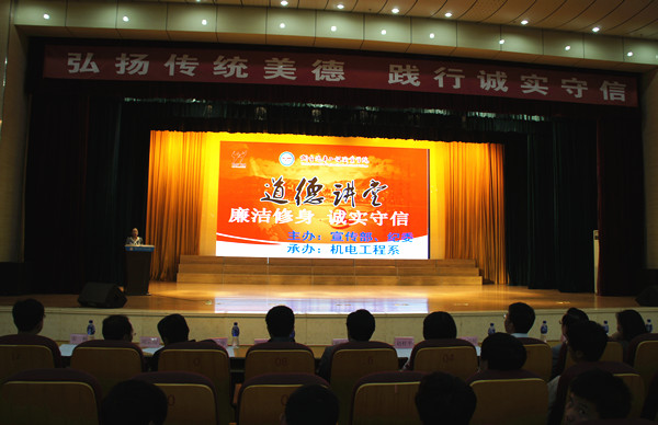 诚实守信重如山。诚信是立德之基,做人之本。现代社会由于受西方不良社会思潮的影响,诚信缺失、有诺不践的现象时有发生,严重影响了整个社会的诚信体系建设,人们强烈呼唤诚信的回归。5月13日下午,“廉洁修身诚实守信”道德讲堂在学院报告厅如期举行。本次道德讲堂由学院宣传部和纪委主办,机电工程系承办,纪委书记孙乃祝、宣传部长赵桂平、机电工程系主任李世一及各系负责学生工作的领导出席活动,机电工程系全体在校学生和辅导员共同参加了本次活动。