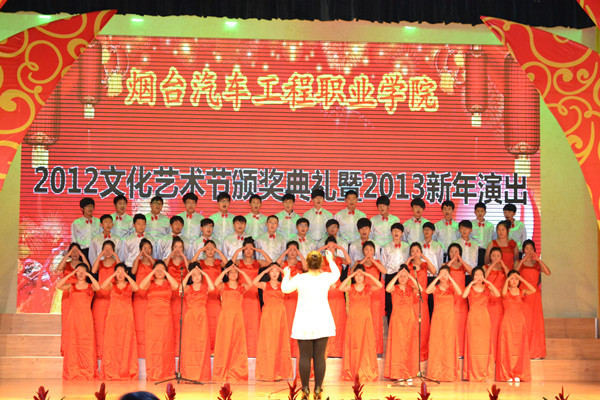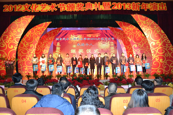 典礼开始,首先由尹桂瓒院长致新年贺词。他回顾总结了2012年学院的学生工作,并对莘莘学子寄予了新年的美好祝愿。本次典礼共颁发艺术节优秀组织奖、先进个人奖等五个奖项,由院领导和企业嘉宾共同为获奖者颁发奖状和奖品,奖品由与我院有“校企合作”协议的企业赞助。新年演出以大合唱《国家》开场,道出“有了强的国,才有富的家”;音乐朗诵《感恩的心》教会学生知恩、感恩、报恩;最后演出在歌曲《我的未来不是梦》中圆满落幕。