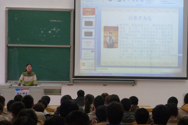 "孝"是中华民族的传统美德之一,为了弘扬孝道,传承民族优良美德,12月14日下午,电子工程系在第五阶梯教室举办了主题为“弘扬孝心 传承孝道”的道德讲堂活动,该系12级学生参加了活动。