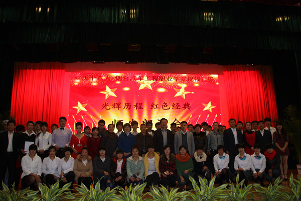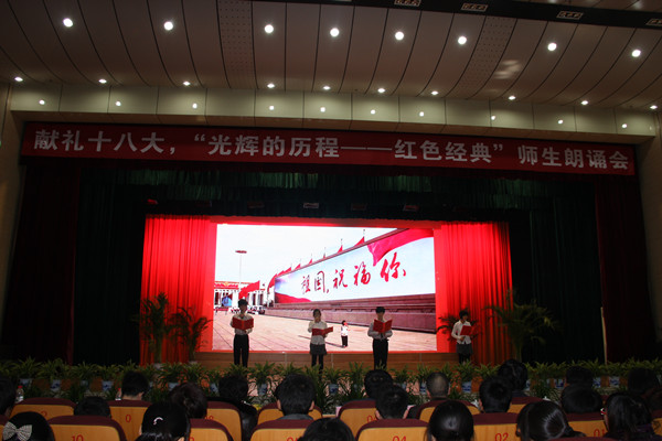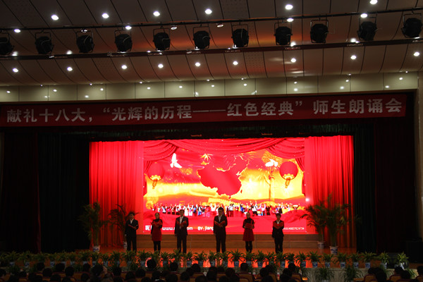 光辉历程,唱响我们青春无悔;党旗飘飘,谱写祖国盛世华章。11月12日下午,由学生处(团委)主办、汽车制造工程系承办的“光辉历程-红色经典”师生朗诵会在此隆重举行。学院副院长房培玉,学生处处长曲健,汽车制造工程系主任姜善涛以及各系部负责同志同1000余师生一同观看了“光辉的历程——红色经典”师生朗诵会。