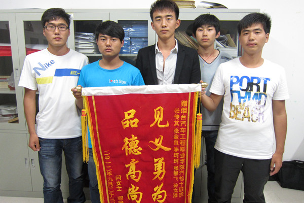 9月24日晚,一面写有“见义勇为、品德高尚”赞语的锦旗被送到了我院学生处。送锦旗的闫女士夫妇专程从开发区赶来,专程感谢我院2012级汽检14班的张传其、张金良、李珂珂、张攀飞和孙文泽五位同学。