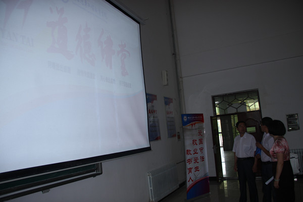 党委副书记于波向督导组介绍了我院“道德讲堂”建设情况:一是成立工作领导小组,下发了《烟台汽车工程职业学院“道德讲堂”建设实施方案》,切实加强领导和管理。学院成立了由院长任组长,分管的党委副书记为副组长,宣传部为牵头部门,学生处、团委、各系、思政部等相互协调的工作领导小组,对道德讲堂加强领导和管理。二是按照“五个一”规范“道德讲堂”的建设。做到固定一个标准场所。把第5阶梯教室作为专门的“学校道德讲堂”场所。正面固定有背景、LOGO标识,两侧利用文字、图片等形式营造出浓厚的道德建设氛围;规范道德讲堂流程,开展“五个一”活动:唱一首歌曲、诵一段经典、看一部短片、讲一个故事、作一点点评;三是建立了一支素质过硬的宣讲队伍,学院聘请中国感恩励志教育讲师团首席讲师黄饶平和学院院级领导、宣传部、学生处、教务处、思政部等部分领导、教师作为学院道德宣讲员;四是形成一套内容详实的台帐(包括电子台帐及纸质台帐),规范有序地积累好资料,有计划、有方案、有活动记载、有总结,活动中还要注意收集照片、录像等影像资料,以充实台帐内容,体现活动成效。五是学院把“道德讲堂”建设纳入学生常规教育常抓不懈,确保活动开展的有特色、见成效,进而提升了学院精神建设水平。督导组在听取了于波副书记的介绍后还查阅了我院“道德讲堂”建设的相关材料,并实地察看了“道德讲堂”的布置情况。督导组肯定了我院在精神文明建设方面所做的努力,对我院的“道德讲堂”建设情况表示满意,同时针对存在的不足提出了改进的意见和措施。