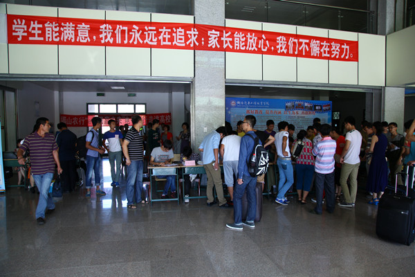为保证新生顺利报到,学院在烟台火车站、烟台长途汽车站及烟台港客运站设立了接站处,专车接送新生及家长,每辆车上配备有两名礼仪志愿者,负责介绍学院概况、周边的主要景点及风土人情。学院统一设有报到咨询处、学籍注册处、绿色通道处、财务收费处、住宿用品供应处,每个系都设立了家长休息区。咨询处相关人员不厌其烦地解答学生及家长的各种疑问;学籍注册处为新生办理注册手续,并为有专业调整需求的学生调剂专业;“绿色通道”咨询处安排专人为新生介绍“绿色通道”详细流程和办理要求,保证家庭经济困难的学生对学院的“绿色通道”有充分的了解;总务处在各学生公寓门前设立住宿用品供应处,确保学生住宿用品得以顺利有序购买;财务处在各系报道点设有收费服务点,为新生提供便利快捷的缴费服务;保卫处负责报道期间校园秩序的维护、可能发生的各类突发治安事件、矛盾纠纷的妥善处理和校园经营秩序的监管;实训中心负责为前来参观的学生及家长提供接待介绍。各系报到现场一派繁忙的景象,到处都活跃着迎新工作人员和大学生志愿者紧张忙碌的身影,身披绶带的志愿者忙前跑后的为初入校园的学弟学妹解疑答惑、引路、提行李、办理入学手续提供热情周到的“一对一”服务。