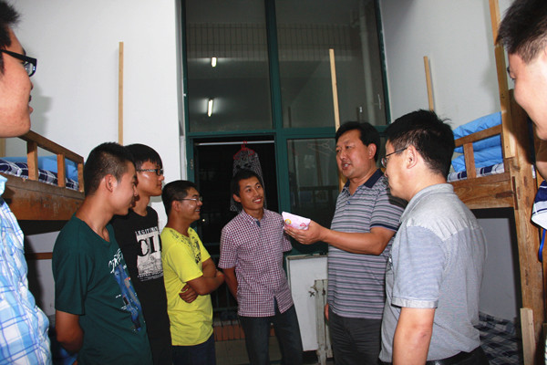 9月3日晚,学院院长尹桂瓒,副院长房培玉、孙涛、姜义昌在办公室、学生处、各系领导的陪同下,分组走访了新生宿舍,了解新生的生活、军训及适应情况。