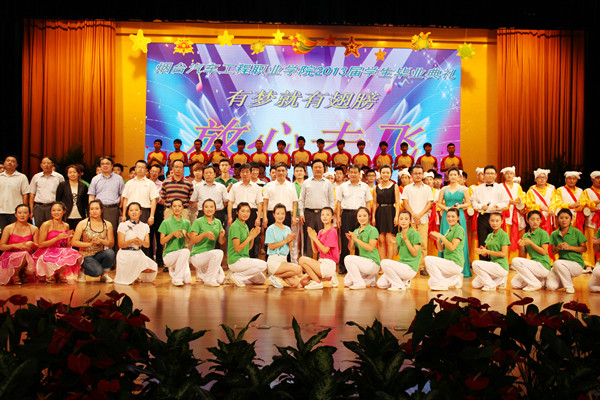 典礼伊始,首先参加典礼的人员共同起立,唱国歌,然后毕业生代表、机电工程系机械制造与制动化专业的满孝佩同学,汇报了自己三年来的学习收获,表达了自己对母校的深深感激和依依惜别之情,在校生代表、经济管理系2011级于青同学则为圆满完成学业即将奔赴工作岗位的学长们送上最美好的祝愿。桃李芬芳千载香,师生情谊万年长。教师代表、汽车制造工程系的王莉老师则为毕业生今后的工作和生活寄予了殷切期望。最后院长尹桂瓒致辞,他代表学院向圆满完成学业即将走上工作岗位的同学们表示最热烈的祝贺,向为学生成长辛勤付出劳动的老师们表示衷心的感谢,在毕业生即将告别母校,奔赴新的征程之际,尹桂瓒院长对毕业生提出了殷切期望,他希望毕业生要以积极的心态对待人生;对生活充满信心和勇气;坚持在实践中不断学习、服务社会、勇于担当;为社会、他人和家庭尽到自己的责任,追求有价值的人生;母校牵挂学子,希望常回家看看。讲话结束后,与会领导与嘉宾为毕业生代表颁发了毕业证书。典礼仪式结束后,激情飞扬的《放心去飞》毕业汇演精彩开启,恢弘大气、场面壮观、撼人心魄的开场舞《鼓舞青春》拉开了演出的序幕,莘莘学子们以歌曲和舞蹈释放激情,放飞梦想,尽情表达自己感恩母校,积极投身社会,实现宏图大志的强烈愿望。