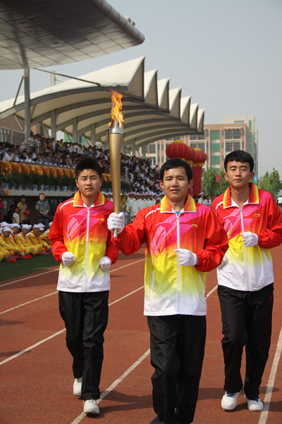 在国旗队、校旗队、彩旗队和花束队的引领下,伴随着运动员进行曲激昂的旋律,裁判员方队、运动员方队迈着矫健而整齐的步伐一一走过主席台,接受主席台领导及嘉宾的检阅。本届运动会开幕式第一次安排了火炬传递这一环节,党委副书记于波将点燃的火炬交给了第一棒火炬手顾贤贤,象征着青春与梦想的火炬在我院学子手中传递,火炬绕场一周后由最后一棒火炬手段德超将火炬盆点燃。