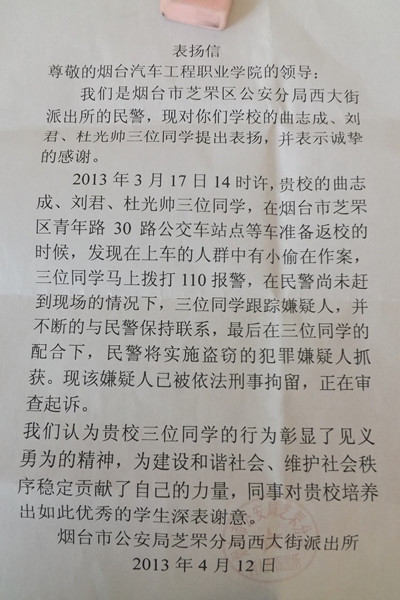 4月12日下午,信息与控制工程系学生科收到了一封由烟台市公安局芝罘分局西大街派出所寄来的“见义勇为”感谢信,表扬并感谢我院2012级电气自动化学生曲志成和刘君及2012级汽车检测与维修技术学生杜光帅三位同学。