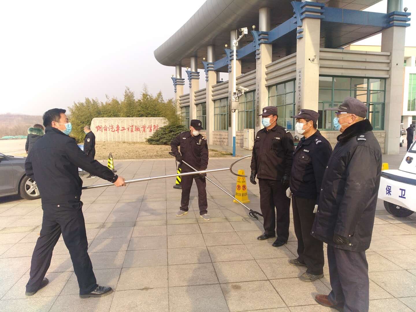 为全面落实省市区新冠肺炎疫情处置领导小组文件要求,进一步抓实抓细学院新冠肺炎疫情防控工作,切实杜绝新冠病毒进入校园,守好校园防疫第一道防线是保卫处和河滨物业公司义不容辞的责任。根据当前疫情防控形势并结合学院实际,保卫处积极协调福山公安分局门楼派出所,于2月23日在学院南门出入关口开展了安保器械培训和应急演练,全面提升安保队伍对安保器械的使用熟练度和处置突发事件能力。