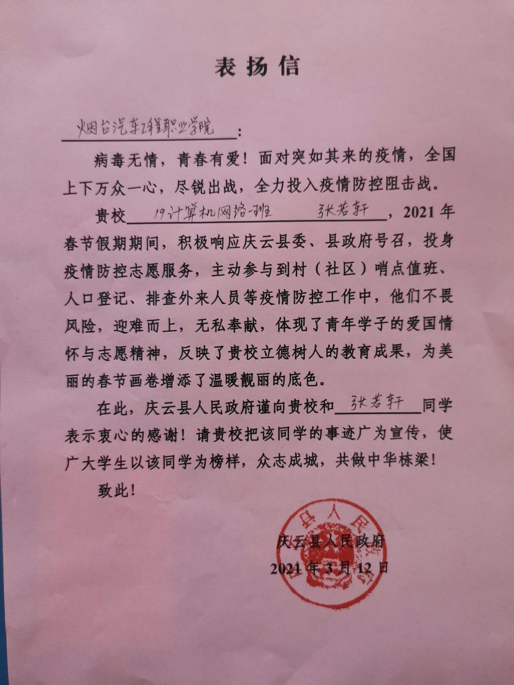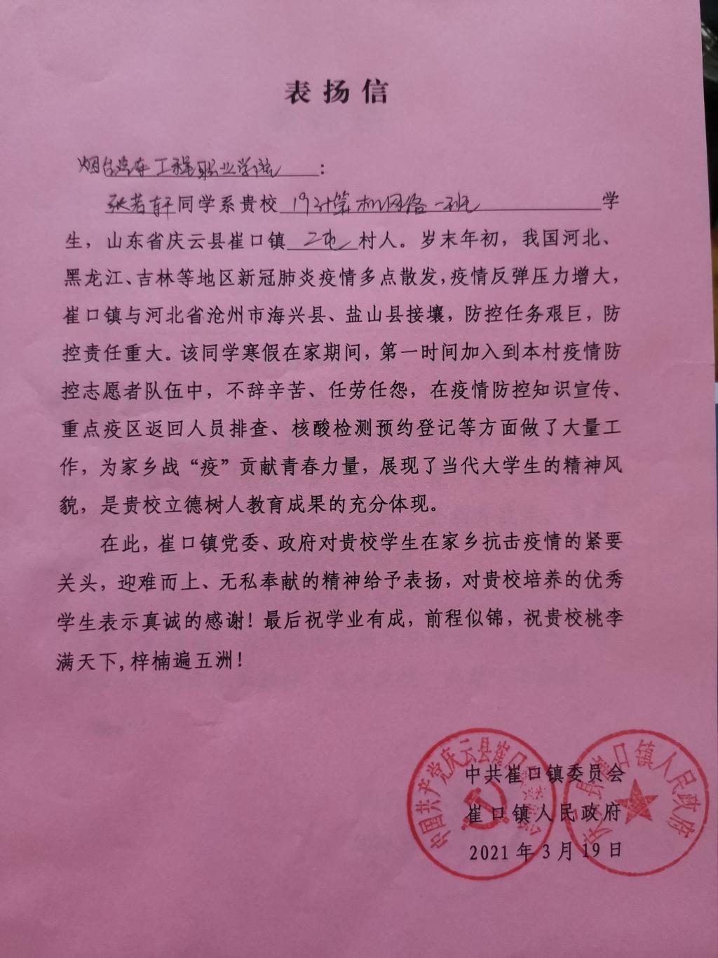 近日山东省庆云县崔口镇党委、崔口镇人民政府向学院发来表扬信,对信息与控制工程系2019级计算机网络技术一班学生张若轩同学寒假期间不顾个人安危,主动深入疫情防控工作表示感谢与赞扬。