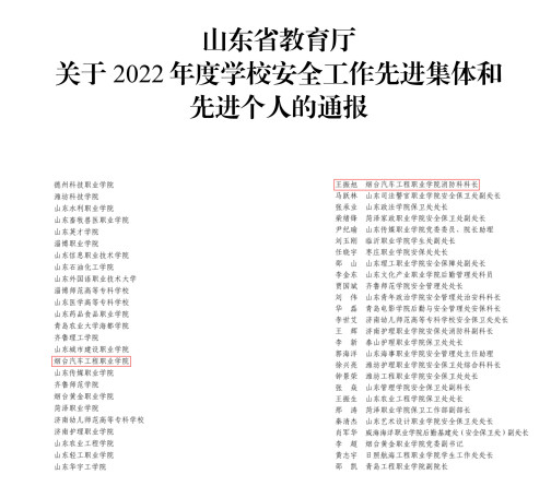 4月12日,山东省教育厅发布《关于2022 年度学校安全工作先进集体和先进个人的通报》,烟台汽车工程职业学院荣获全省“2022年度学校安全工作先进集体”荣誉称号,王振旭获得“2022年度学校安全工作先进个人”荣誉称号。