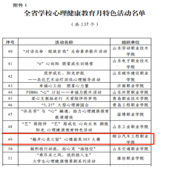 此次活动由山东省教育厅主办,涉及全省各级各类学校,本科高职不分层次同台竞选,评选出全省学校心理健康教育月特色活动137个(中小学72个、高校65个)。学院报送的《“敞开心灵之窗”心情面具 DIY 大赛》被评选为全省学校心理健康教育月特色活动。