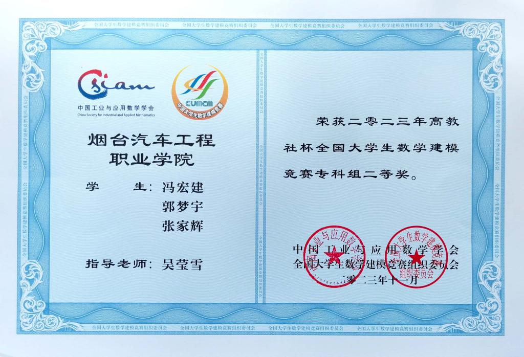 近日,全国大学生数学建模竞赛组委会发布了2023年高教社杯全国大学生数学建模竞赛获奖名单。学院基础教学部吴莹雪和姜田利两位教师指导学生在此次比赛中分别荣获国家二等奖和省三等奖。