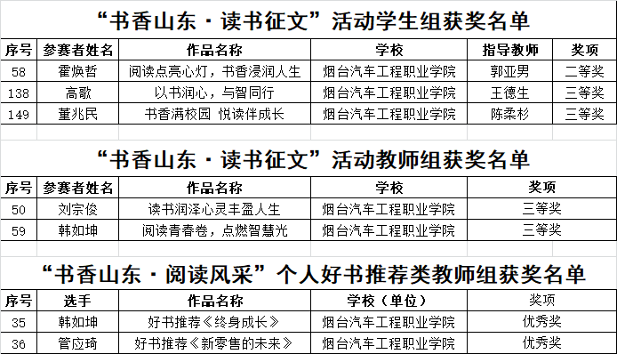 霍焕哲同学的作品《阅读点亮心灯·书香浸润人生》荣获“书香山东·读书征文”活动学生组二等奖,郭亚男老师荣获优秀指导教师奖;高歌同学的作品《以书润心,与智同行》、董兆民同学的作品《书香满校园 悦读伴成长》荣获“书香山东·读书征文”活动学生组三等奖;刘宗俊老师的作品《读书润泽心灵丰盈人生》、韩如坤老师的作品《阅读青春卷,点燃智慧光》荣获“书香山东·读书征文”活动教师组三等奖;韩如坤老师的作品《好书推荐《终身成长》》、管应琦老师的作品《好书推荐《新零售的未来》》荣获“书香山东·阅读风采”活动(个人好书推荐类)优秀奖。
