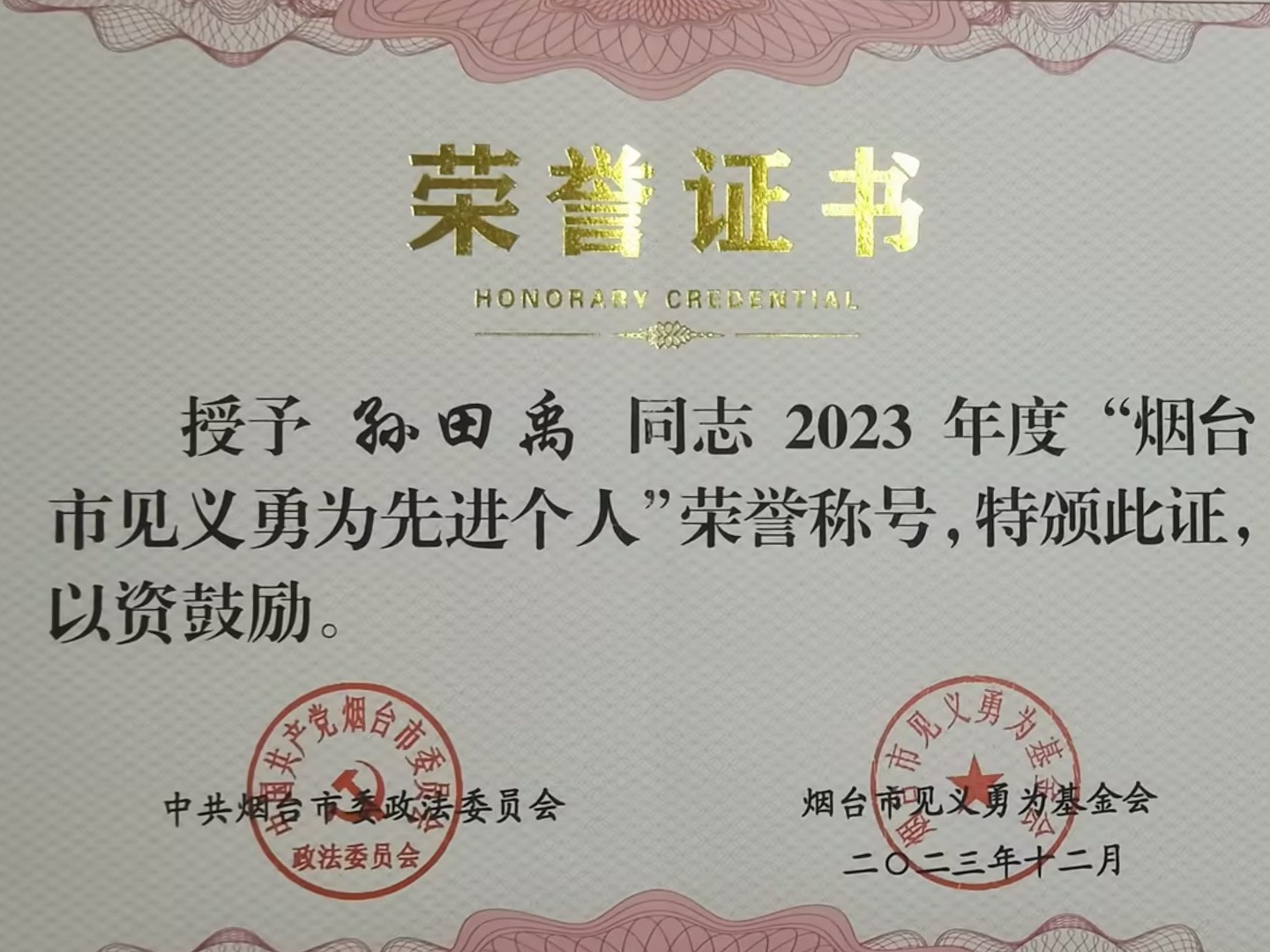 2023年底,中共烟台市委政法委、市见义勇为基金会对烟台市见义勇为先进个人、先进群体候选人进行了事迹公示,我院经济管理系学子孙田禹被授予2023年度“烟台市见义勇为先进个人”荣誉称号。