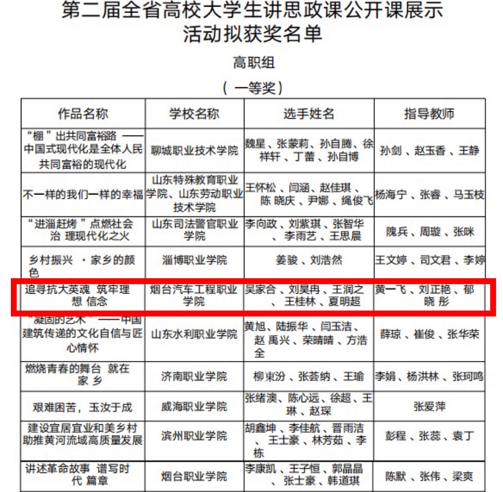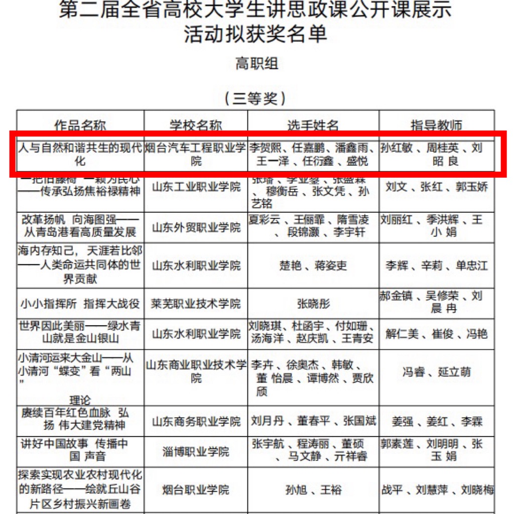 近日,山东省教育厅(省委教育工委)公布了第二届全省高校大学生讲思政课公开课展示活动获奖名单,学院学子获高职组一等奖、三等奖。这是继学院师生团队在第七届全国高校大学生讲思政课公开课展示活动中荣获一等奖后,再次荣获的省级竞赛殊荣。