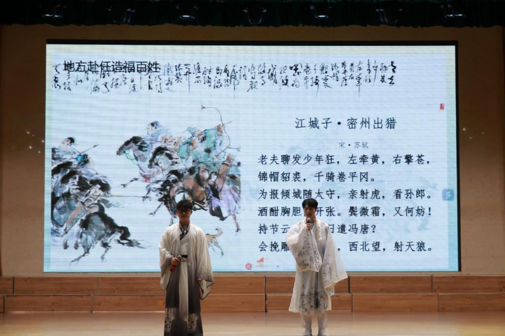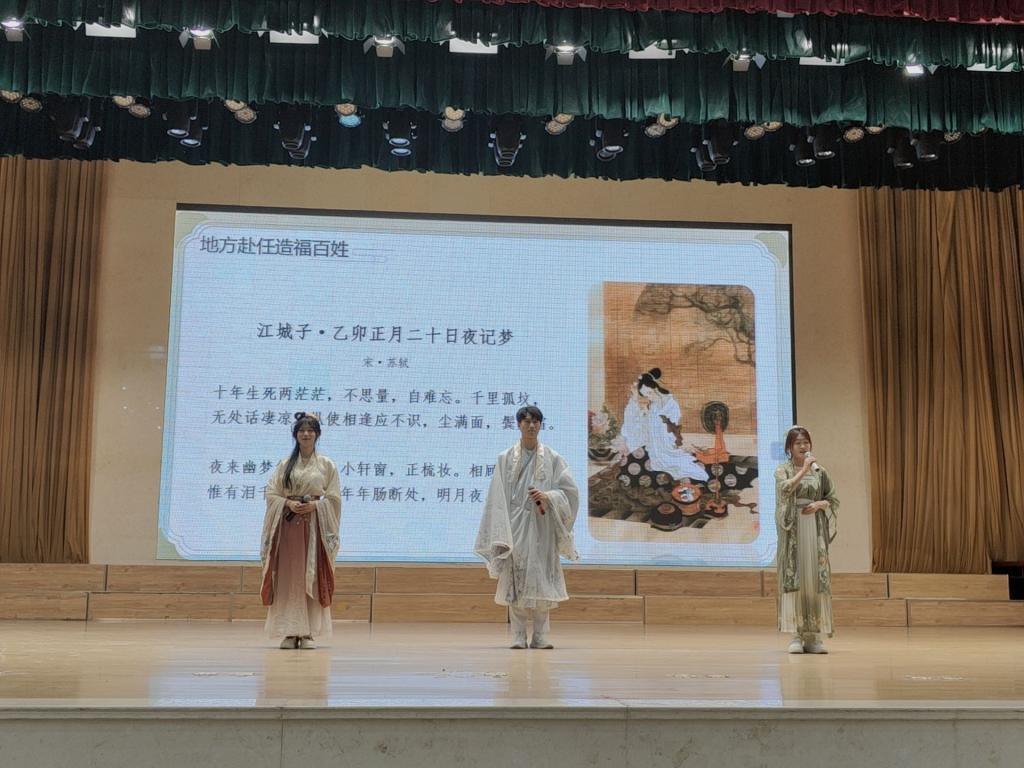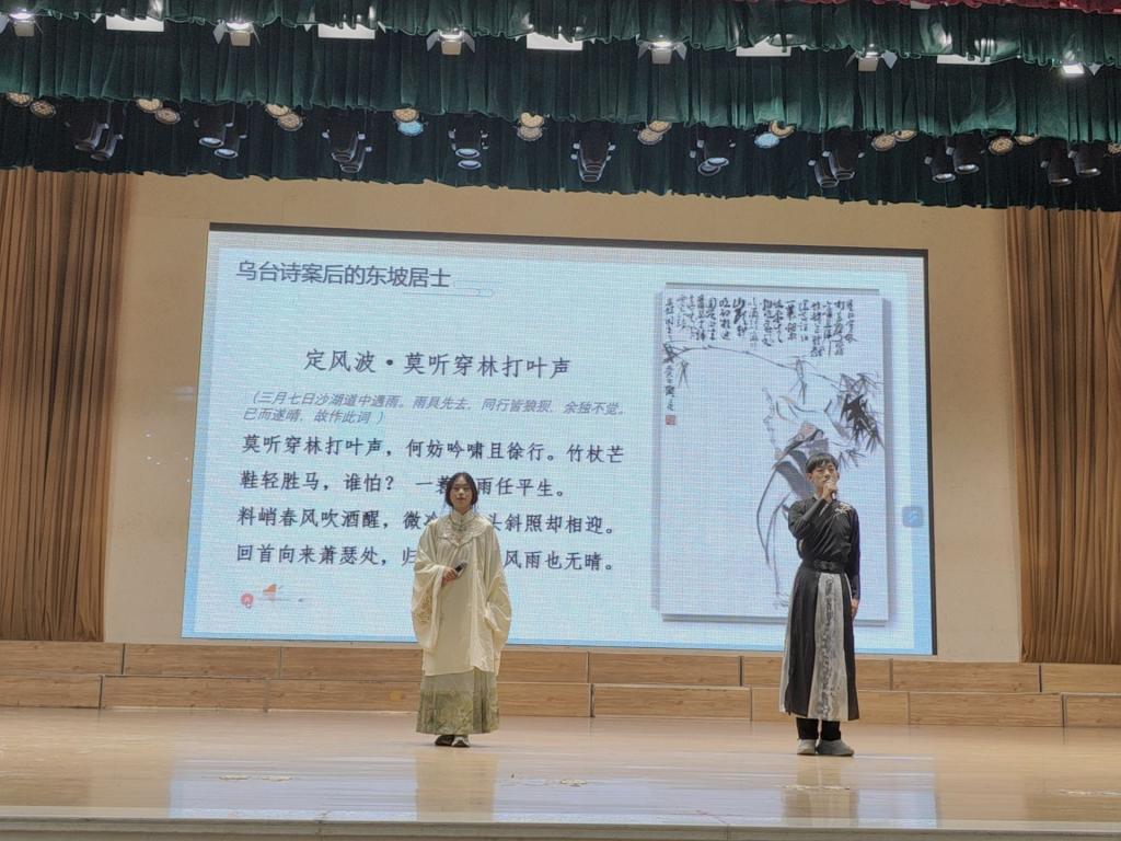 在分享环节,王茜老师以她生动的语言和独到的见解,引领大家走进苏东坡的世界。她详细解读了苏东坡的人生轨迹、文学成就及其对后世的影响,现场同学们更是通过朗诵苏轼的经典诗词《饮湖上初晴后雨》《江城子·乙卯正月二十日夜记梦》《江城子·密州出猎》《定风波·莫听穿林打叶声》、《念奴娇·赤壁怀古》等,以及演唱《水调歌头·明月几时有》,深情演绎了苏东坡的文学魅力,让在场的师生们对这位文化巨匠有了更加深入的了解。