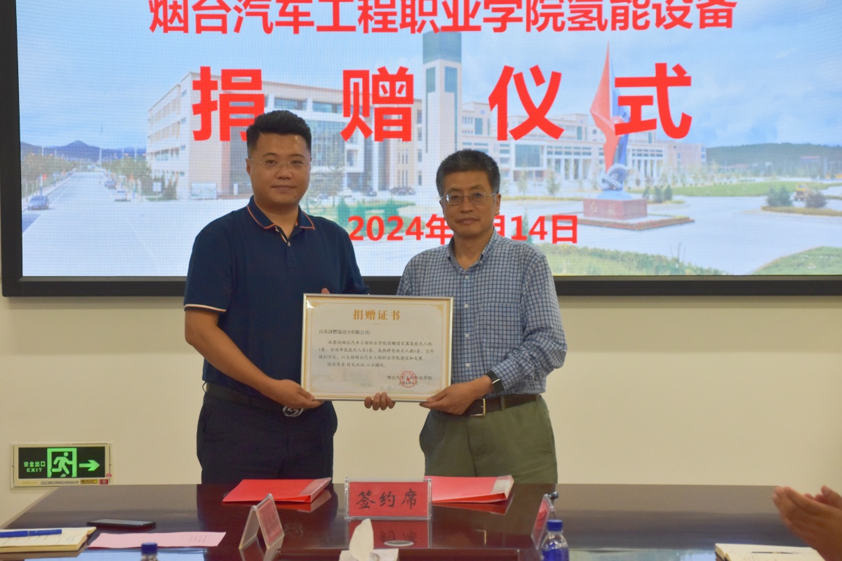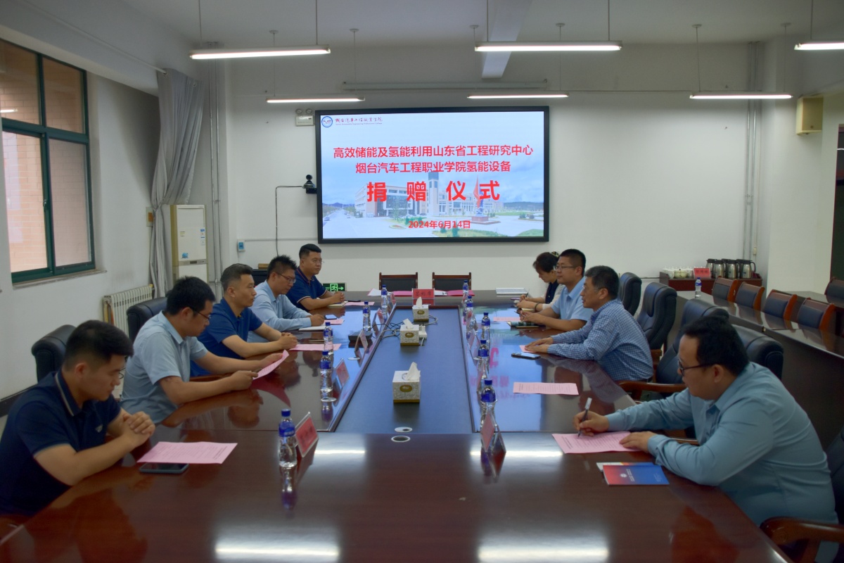 6月14日下午,高效储能及氢能利用山东省工程研究中心氢能设备捐赠仪式在烟台汽车工程职业学院第一会议室举行。学院院长郭峰教授,高效储能及氢能利用山东省工程研究中心于蓬教授、黄河科创联盟氢能专委会秘书处孙宝雷博士、齐鲁工业大学机械工程学部孙会来副教授、中企才教育科技有限公司兴孟令兴董事长、山东济燃氢动力有限公司蒋方坤总经理出席会议,学院电子工程系、智能汽车工程系负责人以及部分专业教师参加本次活动。