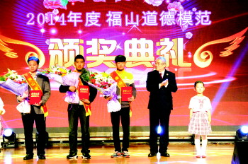 2014年度“福山道德模范颁奖典礼”近日举行,烟台汽车工程职业学院“海风兄弟打工团”荣获助人为乐道德模范,“全国最美检察官”、“山东好人”、“烟台市第四届道德模范”福山区人民检察院副科级检查官王家强为“海风兄弟打工团”代表韩建跃和刘欢颁奖。
