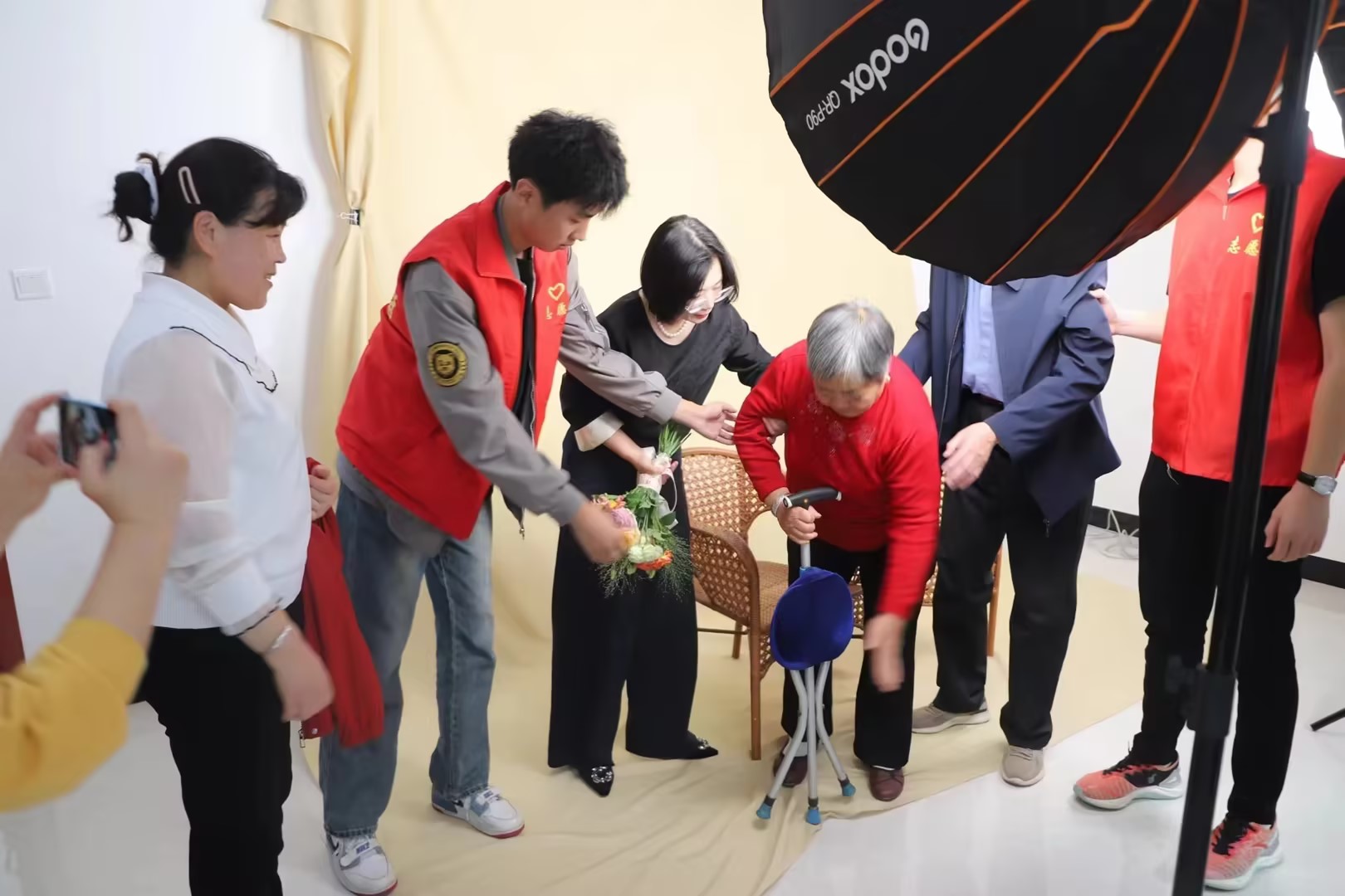 当天上午,志愿者们带着专业摄影设备,满怀热情地来到了民丰路社区。他们为社区的老人们精心布置了拍照背景,还贴心准备了各种道具,确保每一位老人都能收获一张满意的照片。在拍摄过程中,志愿者们细致且耐心地引导老人们摆出不同姿势,或是端坐、或是微笑、或是手捧鲜花,每一张照片都定格了老人们的幸福瞬间。