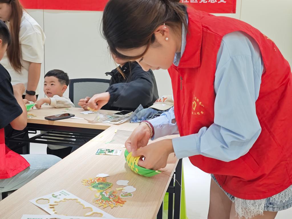 为让孩子们亲身感受非遗手工艺的魅力,志愿者们带领社区儿童制作“端午龙舟挂饰”。裁剪、拼贴、穿绳……在志愿者的耐心指导下,一艘艘色彩斑斓的“小龙舟”在孩子们手中诞生。活动将传统龙舟造型与现代手工结合,既锻炼了动手能力,更让非遗文化以可触可感的方式浸润童心。“我要把龙舟挂在家里,告诉爸爸妈妈这是我自己做的!”孩子们举着作品,脸上洋溢着自豪的笑容。