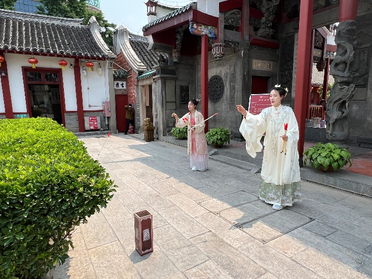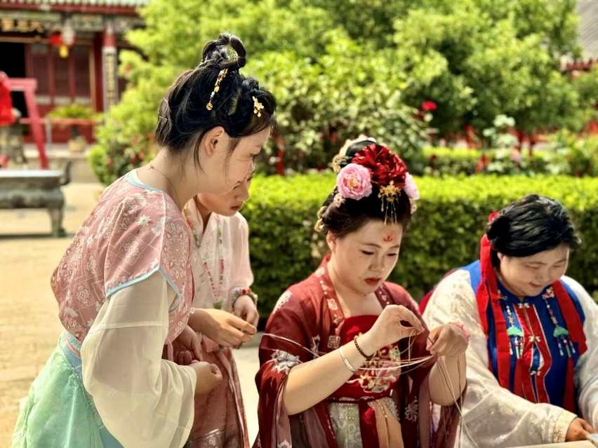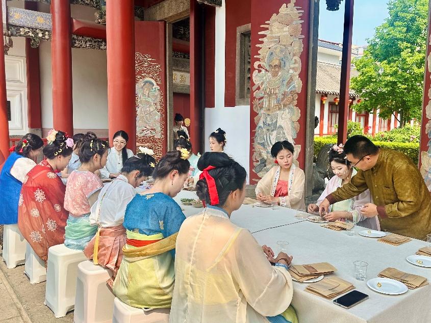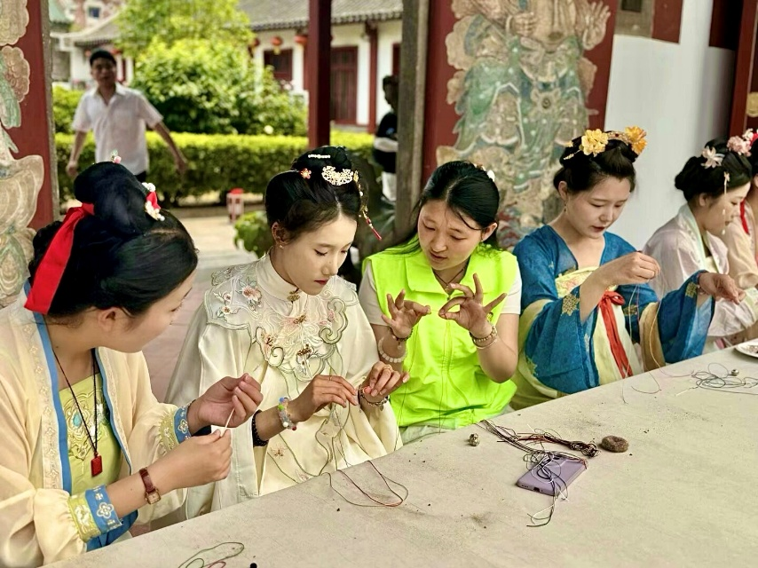 活动中,学生们身着古风服饰,在雕梁画栋的天后行宫内复原宋代蚌粉铃、制作端午节五彩绳,亲身体验传统手工艺的魅力。经济管理系24级市场营销三班张慧萍同学表示:“通过钩织社团的现场教学,我们不仅学会了五彩绳的制作技艺,更深刻理解了端午节的文化内涵。”这些实践环节正是学院将非遗传承融入第二课堂的生动体现。近年来,经济管理系通过开设传统文化选修课、组建汉服社团等形式,引导学生从“旁观者”变为“传承者”,让非遗技艺在青年群体中焕发新生。