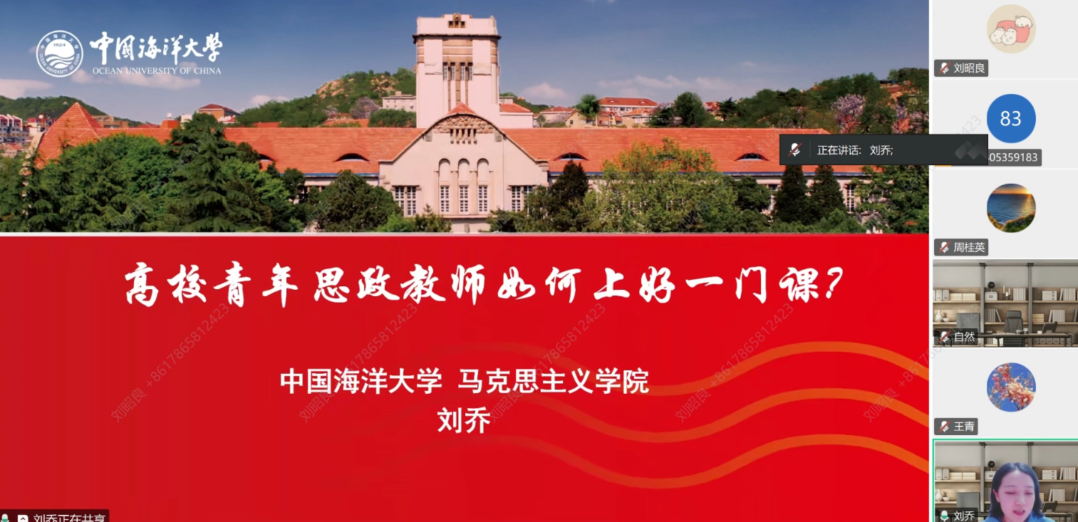 为进一步提升学院思政课教师教学比赛备赛成效,助力思政课教师教学能力提升,12月12日晚上,马克思主义学院通过腾讯会议形式,特邀中国海洋大学马克思主义学院教师、山东省学校思想政治理论课教学比赛特等奖获得者刘乔作思政课教学备赛专题指导。讲座由周桂英主持,马克思主义学院全体教师参与了本次培训。