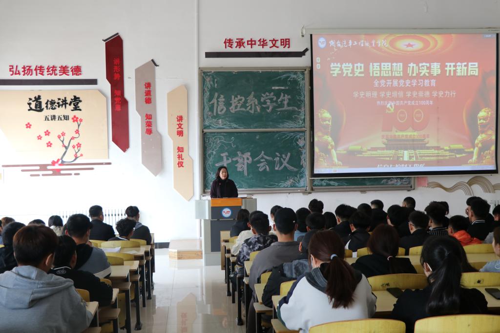 为引导学生正确认识党情国情,做到知史爱党、知史爱国,不断培养爱国之情、砥砺强国之志,进一步推进党史学习、发扬党史学习之风、让“学党史”活动在学生中积极开展,近日信息与控制工程系在阶梯五教室开展了以学习党史为主题的学生干部会议,学生科科长邢瑞晓、副科长韩如坤、专职辅导员、全系112名学生干部参加,会议由学生科副科长韩如坤主持。