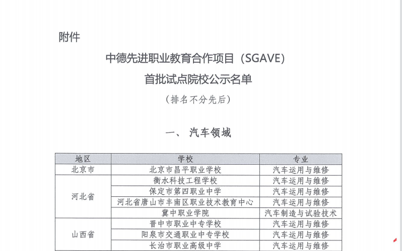 2021年8月教育部办公厅下发关于开展中德先进职业教育合作项目遴选工作的通知,我院汽车检测与维修技术专业参加该项目遴选工作,经过院校申报、省级推荐和部级项目组实地考察,最终在464所院校申报的583个专业中脱颖而出,获评中德先进职业教育合作项目(SGAVE)汽车领域首批试点院校。