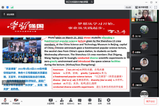 “云端”课程结束后,车辆运用工程系教师深入挖掘此次来自太空的课程资源,以实际课程为有效载体,将“天宫课堂”的内容进行发散式的二次加工与讲授,助力继续点燃强国梦想。“天宫课堂”开讲后的第三天,车辆运用工程系讲授《大学英语》课程的张冬梅老师就将学习强国平台的英语新闻作为教学素材“植入”到自己的线上课堂开场白中。Photo taken on March 23,2022 shows students attending a livestreamed popular-science lecture given by the Shenzhou-13 crew members,at the China Science and Technology Museum in Beijing,capital of China.张老师从词法、句法、语法三方面驾轻就熟地讲解了这句由30个英语单词组成的长句,学生听得意犹未尽,张老师又讲解了此则新闻的其它英文句子。在讲解的过程中教师向学生及时传递了新闻信息,帮助学生树立民族自信和文化自信,勉励学生努力学习外语,将来更好地建设好我们伟大的国家。
