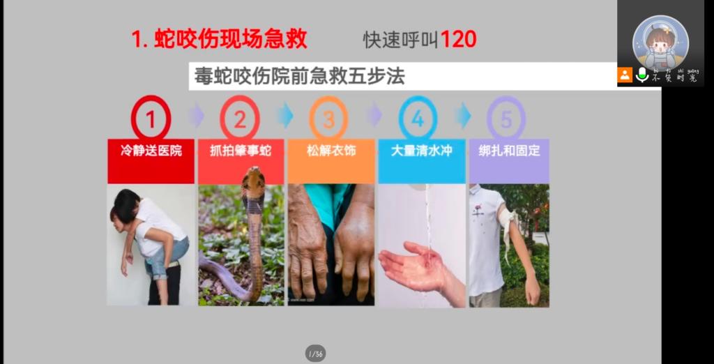 本次活动采用腾讯会议线上培训的方式进行,红十字救护师资王新娟老师,围绕红十字运动的起源、防溺水、动物伤害急救进行授课。王老师首先介绍了红十字运动的基本知识;接着介绍了如何预防溺水和溺水急救的方法;最后王老师又讲述了狗咬伤后伤口处理的原则及毒蛇咬伤中毒等动物伤害急救方法。