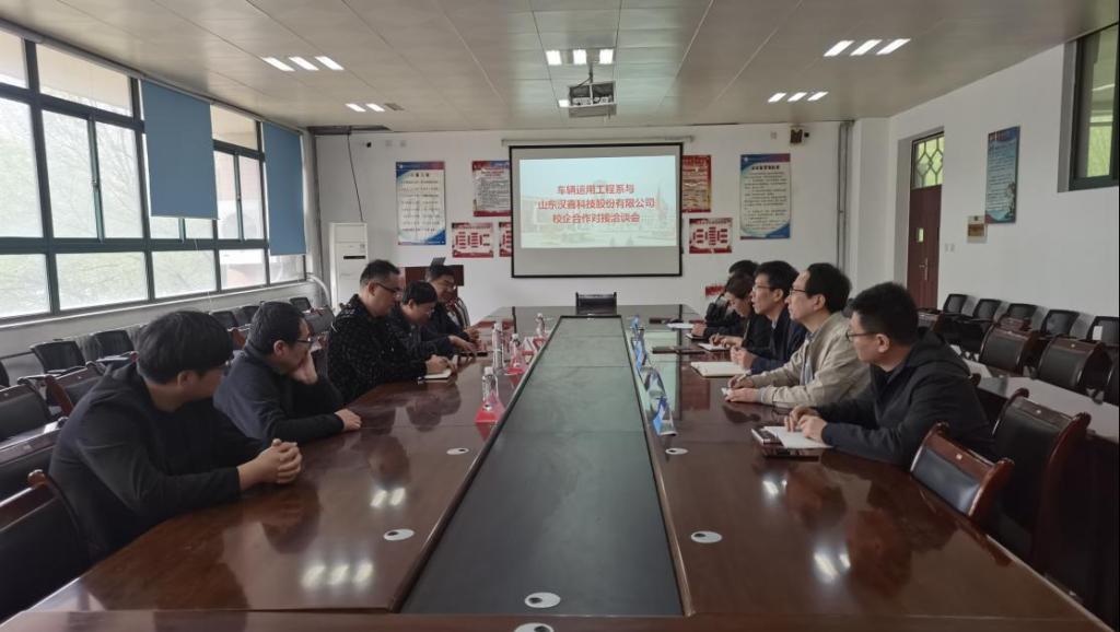 4月28日,山东汉鑫科技股份有限公司解景阳院长、王金泽经理、迟海、孙凤超等一行五人到学院洽谈校企合作项目。车辆运用工程系主任王永浩、副主任白秀秀、科研科科长李臣华、教学科科长汤少岩等六人参加了洽谈会议。